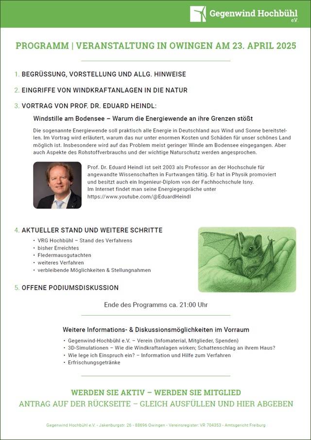 Am 23. April 2025 informierte der Verein Gegenwind Hochbühl e.V. im Kultur|O Owingen rund 160 Bürger über den aktuellen Stand des Wind-Vorranggebietes auf dem Hochbühl. Mit einem Video und in Vorträgen zeigte der Verein die möglichen negativen Folgen für Natur und Landschaft auf und verwies auf die geringe Windleistung in der Bodenseeregion.